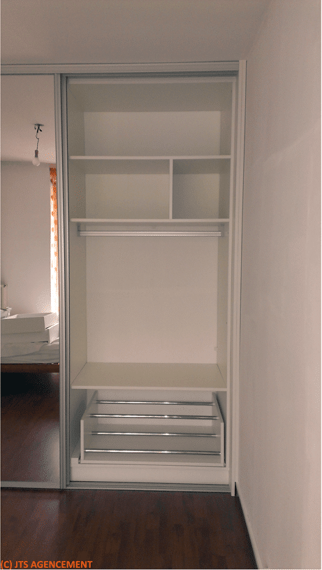 JTS AGENCEMENT a conçu et installé ce petit dressing pour Mme C. De fabrication française, il concentre sur un peu plus de deux mètres, deux penderies, trois petits tiroirs, un rangement à chaussures et de multiples tablettes réglables. Les deux vantaux d’un mètre de long chacun offrent un accès généreux aux effets rangés à l’intérieur.