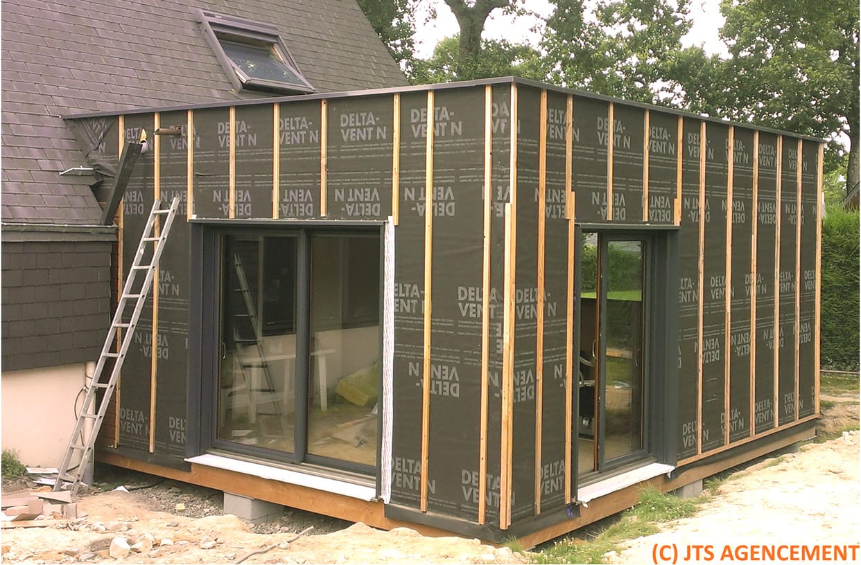 Pour l’extension ossature bois de M et Mme L., nous avons retenu des menuiseries mixtes bois/aluminium de chez PASQUET MENUISERIES. Performantes, élégantes et simples à mettre en oeuvre, ces menuiseries allient l’esthétique et la simplicité d’entretien de l’aluminium à l’extérieur à la beauté du bois à l’intérieur.