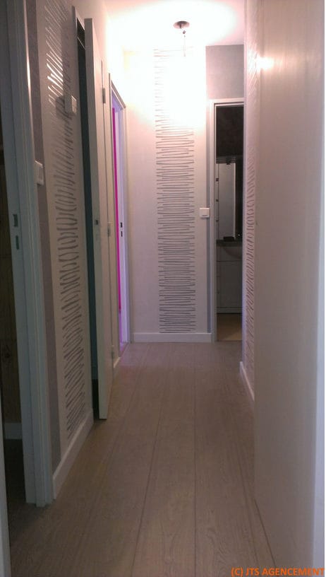 Pose d’un parquet stratifié dans un couloir aux formes alambiquées sur lequel débouchent de nombreuses portes à montants métalliques.  Patience et minutie sont de rigueur car impossible d’entailler les pieds d’huisserie pour glisser les lames de parquet en dessous ! Histoire de pimenter le tout, le client souhaitait avoir la continuité du sol entre le couloir et deux des pièces desservies. Enfin, les deux murs principaux du couloir ne sont pas tout à fait parallèles. Finition parfaite grâce à un mastic acrylique dont la teinte est quasi identique à celle des huisseries.