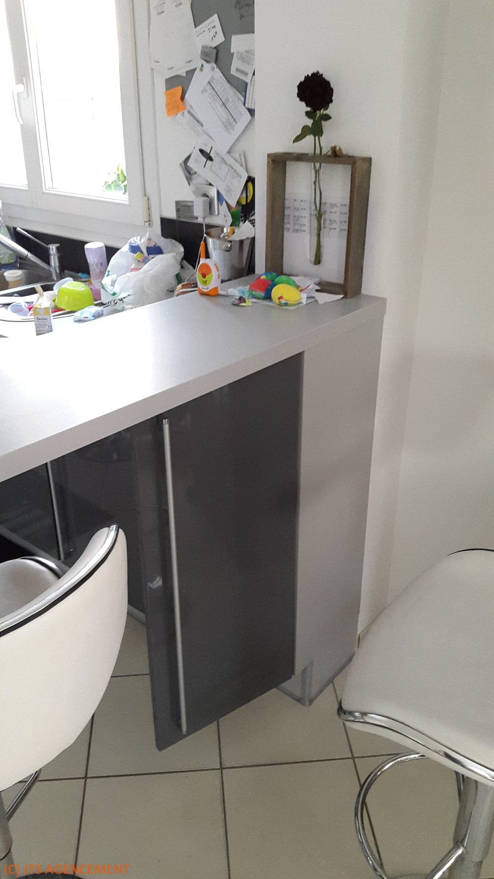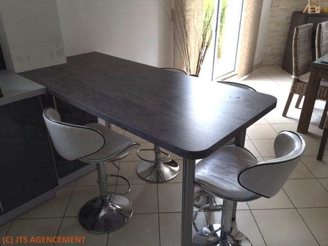 Chez M et Mme L, la table de cuisine était de forme originale mais étroite. De plus, sa hauteur ne leur convenait pas. JTS AGENCEMENT a fait fabriquer sur mesure une nouvelle table aux dimensions généreuses de 800×1700 mm dans le stratifié de leur choix. Après réduction en hauteur du caisson de cuisine situé en dessous, la table est désormais à la même hauteur que le plan de travail.