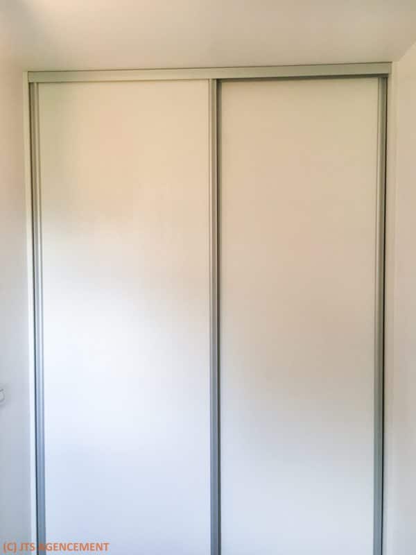 La façade coulissante à deux vantaux de ce placard a été réalisée avec les profils aluminium de la gamme ESPRIT dont le galbe fait le succès. Les panneaux sont en mélaminé décor blanc texturé bois d’épaisseur 19 mm. L’aménagement intérieur présente une petite originalité : il a été réalisé en châtaignier massif. Ce plot de châtaigner brut de sciage était remisé chez le client depuis plusieurs décennies. Un vrai régal à travailler !