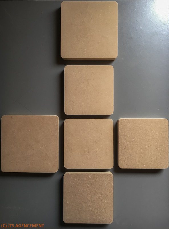 Usinages de pavés de 13×13 cm et 15×15 cm en MDF d’épaisseur 19 mm, destinés la réalisation de lettres décoratives. Ces pavés peuvent être fabriqués dans toutes les épaisseurs disponibles de MDF, ainsi qu’en bois massifs..