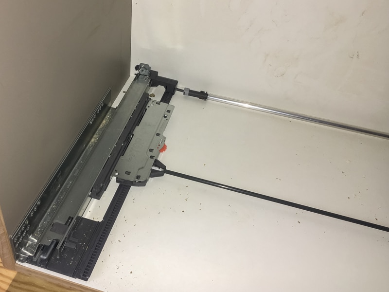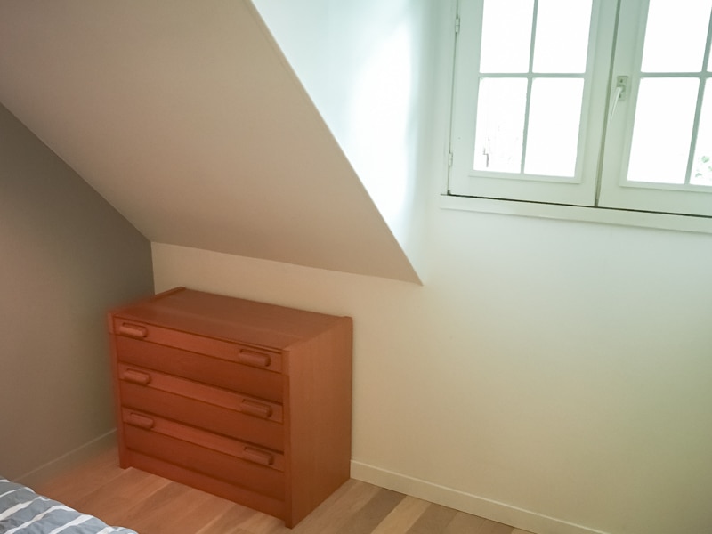 Réalisation d’un petit agencement destiné à remplacer une commode. Les trois tiroirs sans poignées sont de dimensions généreuses avec une largeur d’1m30. Ils sont montés sur des coulisses à sortie totale, pour un accès optimal au contenu. En plus de l’ouverture touche-lâche, ces coulisses assurent une fermeture douce et silencieuse quel que soit l’élan donné au tiroir pour le fermer. Le mélaminé gris argile (EGGER U727 ST9) est ici associé à des chants en châtaignier massif.