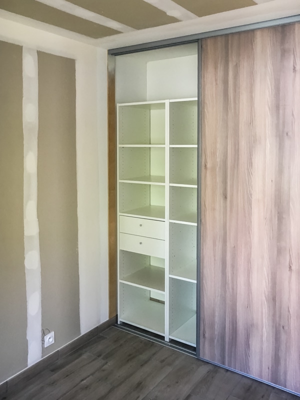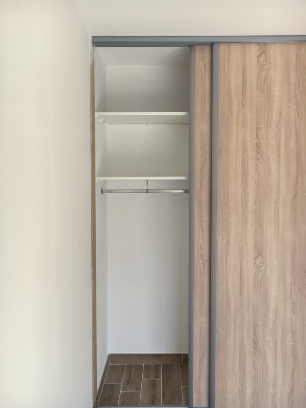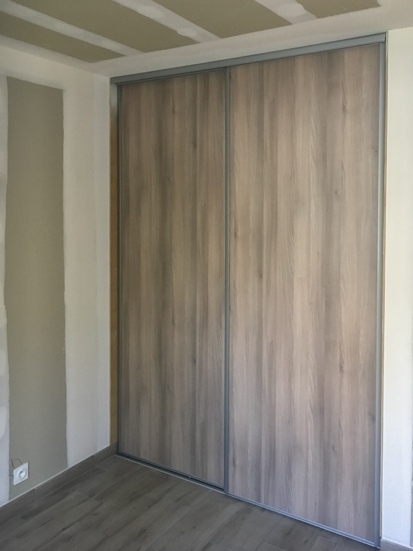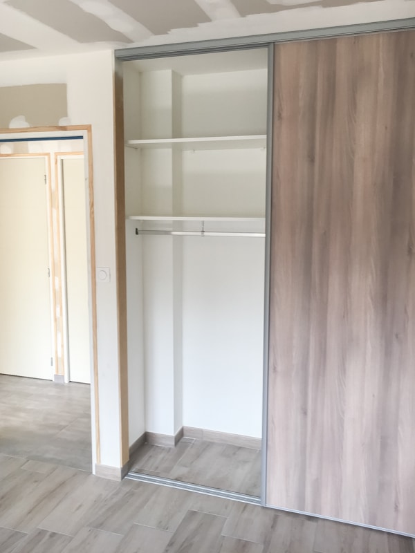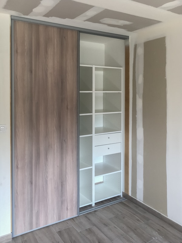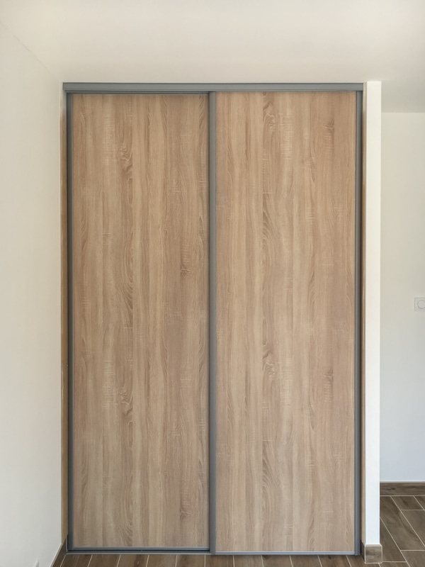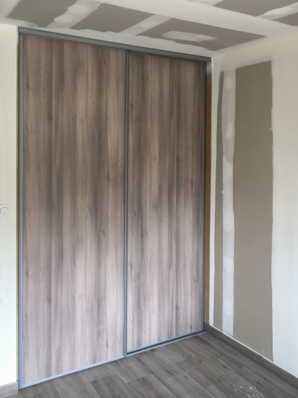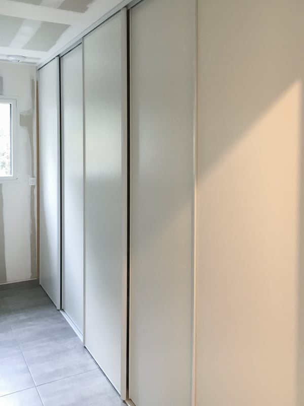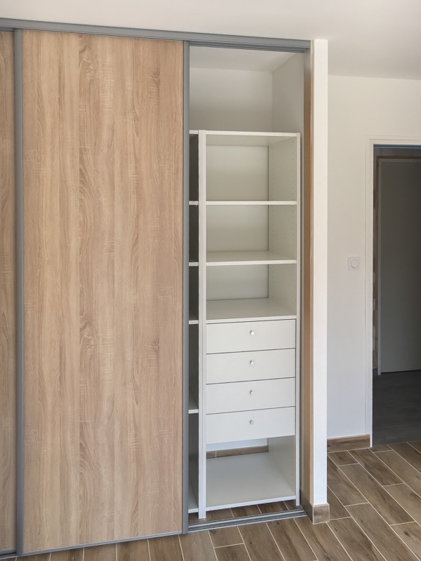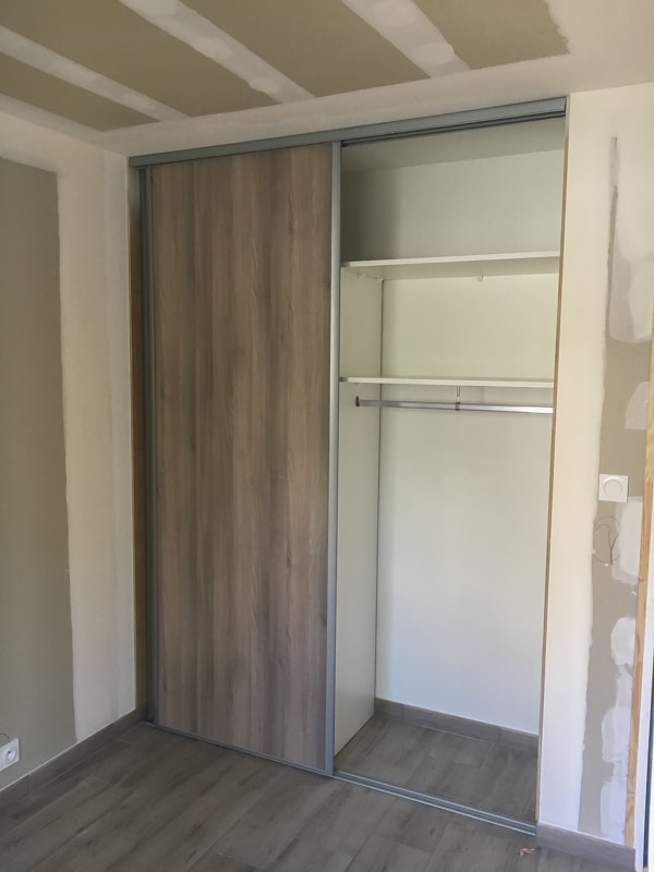 Installation de 5 placards coulissants pour trois chambres, une entrée et un cellier. Les façades coulissantes proviennent de la gamme SIFISA. Des vantaux miroir équipent le placard de l’entrée. Ceux du cellier sont en panneaux blancs texturés (veinage bois). Enfin, chaque chambre accueille une façade en panneau décor bois assorti à son carrelage. Les aménagements ont été conçus et réalisés intégralement sur mesure pour l’entrée et le cellier. Ceux des chambres utilisent des colonnes SIFISA montées telles quelles ou bien modifiées sur chantier pour répondre au besoin du client….